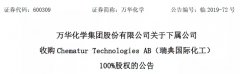 2019年7月31日,萬華化學公告稱,萬華化學集團股份有限公司(以下簡稱“萬華化學”)境外全資下屬公司 萬華化學(...