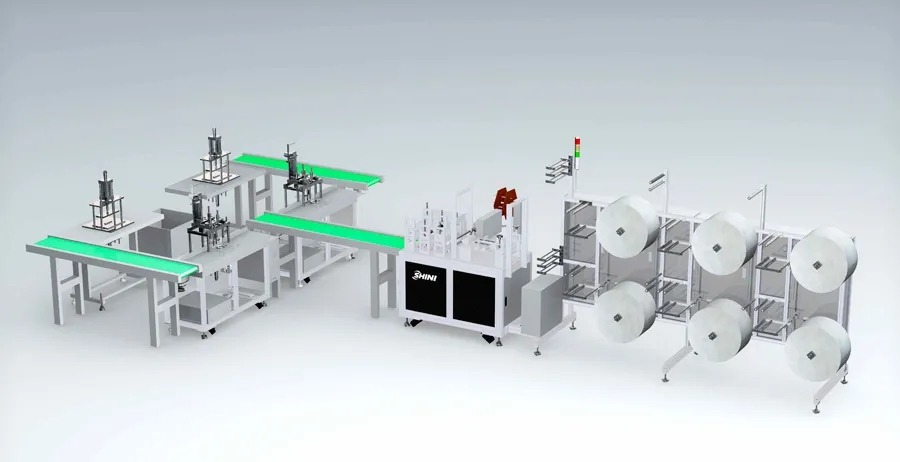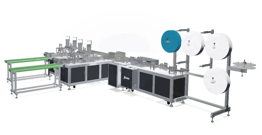 鑒于新型冠狀肺炎疫情在全球的大范圍持續傳播,為防疫物資的生產帶來了極大的挑戰,其中最基本的防護用品口罩的需求成幾何倍數的增加。做為一家行業內全球知名的設備生產商,信易自動化事業處快速反應,繼推出SMKS全自動一拖二平面口罩機后,全新推出N95/KN95口罩生產設備,主要用于N95/KN95口罩成型,整卷布料放卷后經過滾輪驅動上料,布料通過自動上料,鼻梁條整卷牽引開卷,定長裁切后導入至包邊布料中。口罩外形通過超聲模具滾焊,焊接封邊,經滾切刀裁切成型,通過滾筒將成型的口罩進行輸出,再由人工用超聲波焊接耳帶,最后對口罩進行封邊,標準整套設備:打片機x1+封邊機x2+耳帶機x2。