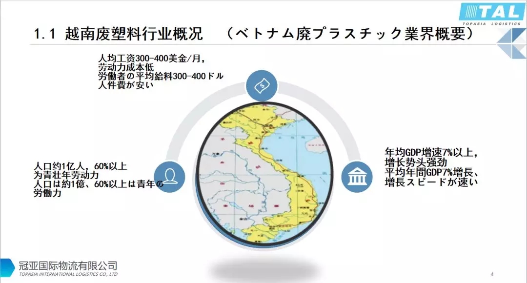 ????????越南廢塑料需求位居東南亞各國之首,再生塑料在越南的市場有PET,PP,PE,PS,ABS,PA。主要進口港口:海防,胡志明。