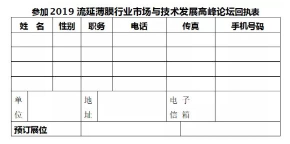 ????????1、請(qǐng)將上述回執(zhí)表于2019年12月20日前發(fā)郵件到ppack@126.com或發(fā)微信到13693270591(流延薄膜)。