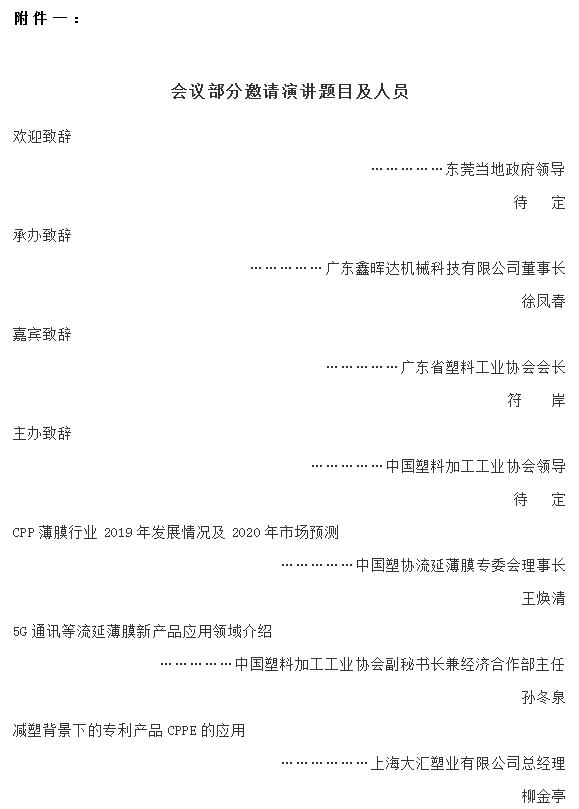 ????????為了交流行業(yè)信息,推廣新技術(shù)、新設(shè)備、新材料,鼓勵(lì)技術(shù)創(chuàng)新,促進(jìn)行業(yè)發(fā)展,中國塑協(xié)流延薄膜專業(yè)委員會(huì)(簡稱流延薄膜專委會(huì))將于2019年12月26日-27日在廣東東莞召開“2019流延薄膜行業(yè)市場與技術(shù)發(fā)展高峰論壇暨流延薄膜專委會(huì)換屆大會(huì)、流延聚乙烯纏繞膜、牧草膜行業(yè)誠信與創(chuàng)新發(fā)展聯(lián)盟成立大會(huì)暨《流延聚乙烯纏繞膜》團(tuán)體標(biāo)準(zhǔn)第一次工作會(huì)議”。