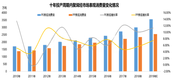 ????????隨著新型城鎮化、新型工業化、農業現代化和國際貿易發展等對聚烯烴需求的總體支撐,以及國民高質量生活、教育、醫療、養老等服務性需求提升,聚烯烴在新材料、汽車輕量化、綠色建材、醫療器械、食品級包裝、電子電器小型化等方面的應用日益廣泛。生育政策放開、人口老齡化、醫療需求增加等都刺激高品質聚烯烴樹脂需求增長,因此近幾年國內聚烯烴產能經歷了快速到高速的增長。PE非耐消費品占比在73%,PP在66%,一次性快消品的需求特征決定其需求相對穩定。