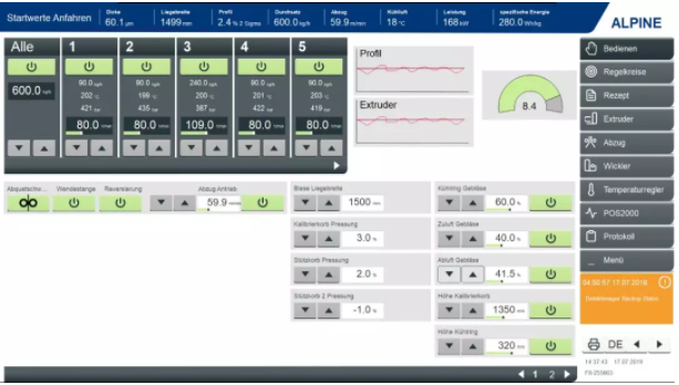 ????????除了擠出控制之外,Syncro還為希望實現整個生產線的單點控制的吹膜制造商開發了Syntrol? 監控系統,該系統可以通過一個觸摸屏顯示和同步多個生產線控制。這些控制包括對擠出機的溫度和壓力、空氣環、IBC、厚度計、籠和牽引的控制。