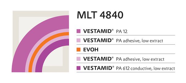 ????????MLT 4840的特殊之處在于,它的內(nèi)層不是由含氟聚合物制成,而是由導(dǎo)電、低淬取性的VESTAMID聚酰胺612制成。因此,該系統(tǒng)非常適合使用擠出工藝加工,即使在與酒精長期接觸后也有優(yōu)異的抗靜電性能。