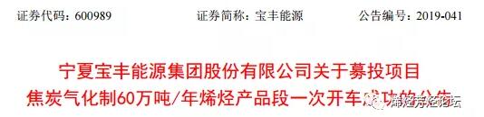 ????????公告顯示,焦炭氣化制60萬噸/年烯烴項目是寶豐能源首發上市募集資金投資項目,項目總投資金額達152.79億元。該項目主要分為兩段:前段焦炭氣化制220萬噸/年甲醇項目,后段甲醇制60萬噸/年聚烯烴項目,以及相關配套公用工程,預計將于2019年底前全部建成投產