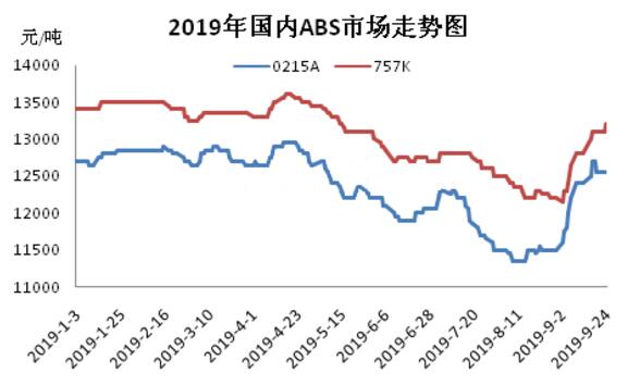 ????????2019年三季度,國內ABS市場呈現出先抑后揚的態勢,以余姚市場吉化0215A為例,價格運行區間在11350-12700元/噸。