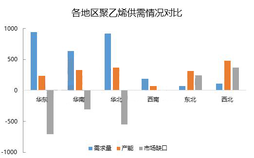 ????????近年國內產能的不斷增加,各地區供需情況也有所改變。東北地區是我國老工業基地,是中油系統裝置集中地區,東北地區下游需求占國內需求占比較小,是國內PE產品輸出型地區。另外,西北地區依托豐富的煤炭資源,近年煤制裝置搞通文化路,西北地區產能快速增長。西北地區同東北地區一樣,產能分布集中,但下游需求較少,也是我國主要的PE產品輸出地。國內主要的下游需求地區為華東地區、華南地區和華北地區。其中,最大的消費地區為華東地區,華東地區聚乙烯消費點全國總消費量的三分之一左右,但華東地區當地擁有的產能有限,占全國總產能的13%。華東地區年PE消費量在900萬噸以上,進口產品充斥華東市場。華東區域是PE產品最大的凈流入地區,隨著國際與國內的快速擴能,華東地區是進口產品與國產產品必爭之地,價格競爭也將進入白熱化狀態,未來華東地區很可能成為國內價格洼地,進口低價產品對市場價格沖擊明顯。華北地區與華南地區作為主要的消費地區,情況與華東地區相類似,是國內外PE產品的主要消費目的地,來自供應端的壓力不斷增加,市場競爭日益加劇。
