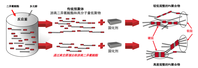 與相當的常規預聚體相比,采用低游離預聚體生產的聚氨酯產品在硬段和軟段之間具有更徹底的相分離、更窄的分子量分布和更高的交聯度,從而使最終產品具有更優異的性能。