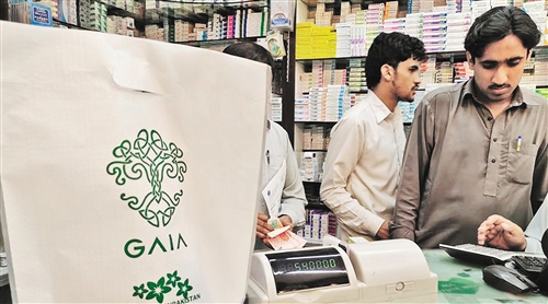????????巴基斯坦政府日前頒布“禁塑令”,首都伊斯蘭堡全面禁止使用一次性不可降解塑料袋,違反者將受到嚴(yán)厲處罰。旁遮普省、信德省等地也將很快實(shí)施類似法規(guī)。圖為藥店提供的收費(fèi)環(huán)保袋。