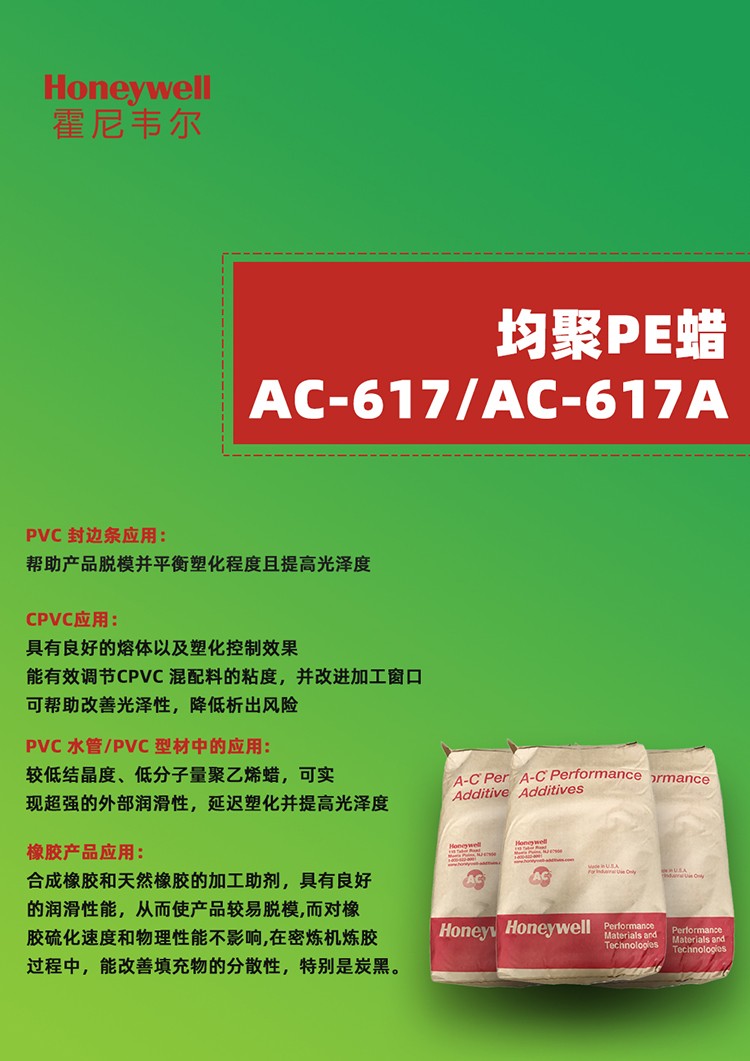 霍尼韋爾HoneywellAC-617A聚乙烯蠟是一種低密度非氧化的聚乙烯蠟,AC-617A聚乙烯蠟應(yīng)用在產(chǎn)品中可提高擠出速率、并保持表面的光澤度。在塑料、PVC塑料、PVC專用潤滑劑的應(yīng)用非常廣泛。