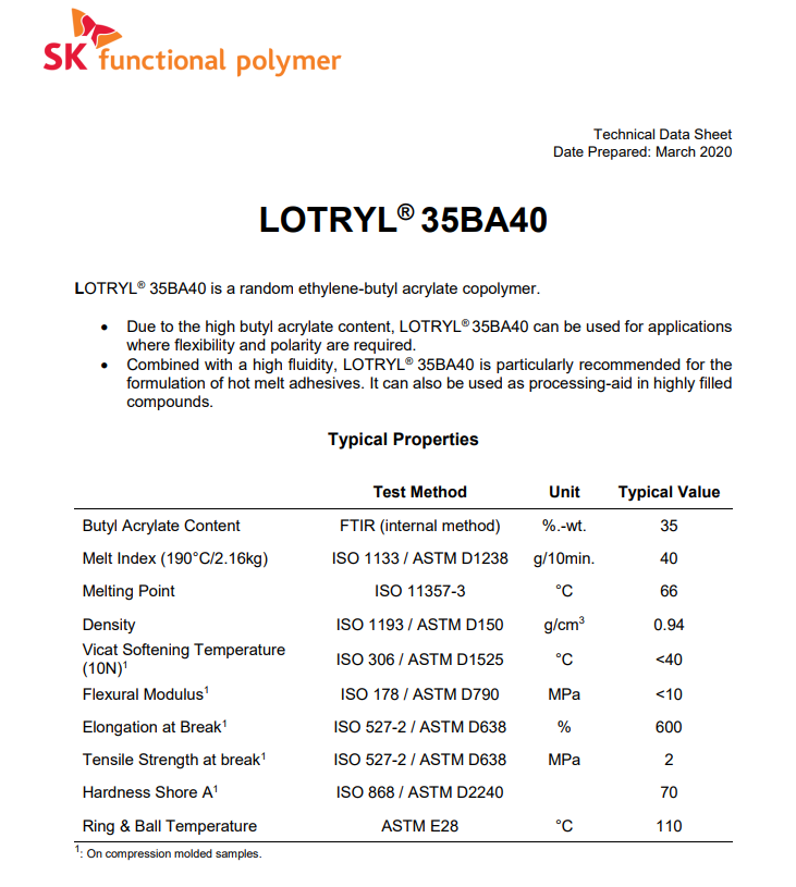 - 阿科瑪增韌劑相容劑EBA Lotryl 35BA40 物性表, 阿科瑪增韌劑相容劑EBA Lotryl 35BA40 產品參數,阿科瑪增韌劑相容劑EBA Lotryl 35BA40 性能表,阿科瑪增韌劑相容劑EBA Lotryl 35BA40 出廠報告, MSDS,, 物質安全資料表, UL黃卡,{ SGS報告, RoHS, 食品級認證, NSF飲用水標準, 產品資料, 產品性能, 出廠報告, 原廠原包, 代理商, 熱變形溫度, 熔指數, 流動系數, 抗沖擊性能、沖擊強度, 低溫韌性、低溫抗沖擊性能, 熔體流動系數、熔體流動速率, 加工工藝、加工參數、加工溫度, 歐盟RoHS 德國FDA 美國FDA 日本FDA