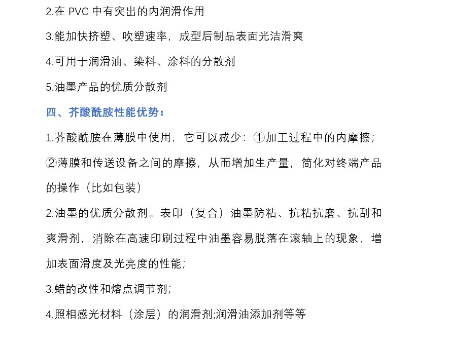 作用原理:在制品冷卻成型階段后,通過酰胺分子向制品表面遷移,形成一層薄薄的潤滑層,從而起到爽滑抗磨抗粘連的作用。