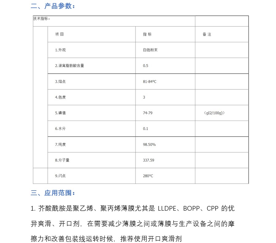 ● 芥酸酰胺是一種從植物油中精煉的具有低色度(90Pt-Co)和低水分含量(100mg/kg)的芥酸酰胺。芥酸酰胺具有優良的爽滑性和良好的防粘連性能。加入芥酸酰胺并充分預混,可有效降低聚合物和設備、聚合物與聚合物間的摩擦力和附著力,使加工速度和產品質量得到大副提升。