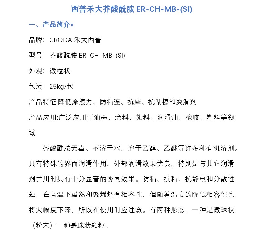 - 英國禾大CRODA芥酸酰胺 ER-CH-BE 物性表, 英國禾大CRODA芥酸酰胺 ER-CH-BE 產品參數,英國禾大CRODA芥酸酰胺 ER-CH-BE 性能表,英國禾大CRODA芥酸酰胺 ER-CH-BE 出廠報告, MSDS,, 物質安全資料表, UL黃卡,{ SGS報告, RoHS, 食品級認證, NSF飲用水標準, 產品資料, 產品性能, 出廠報告, 原廠原包, 代理商, 熱變形溫度, 熔指數, 流動系數, 抗沖擊性能、沖擊強度, 低溫韌性、低溫抗沖擊性能, 熔體流動系數、熔體流動速率, 加工工藝、加工參數、加工溫度, 歐盟RoHS 德國FDA 美國FDA 日本FDA