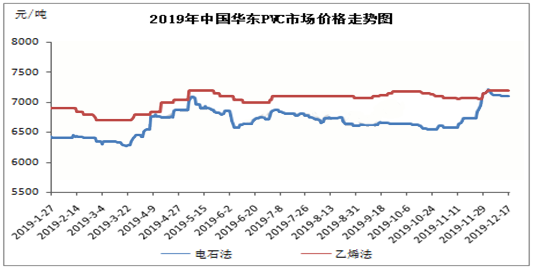 2019年,PVC行情可謂是變化無常,全年呈現旺季不旺、淡季不淡的特點。與往年不同,全年價格最低點出現在3月份,而價格最高點出現在12月。截止12月中旬,PVC市場價格創新高后出現回落,各主銷地區市場價格陸續小幅松動,貿易商出貨多隨行就市為主,個別小幅讓利,下游依舊維持剛需,受利潤空間影響,接貨并不積極。PVC期貨偏弱震蕩以及市場貨源緊缺狀態有所緩解是目前價格出現松動的主要原因,但前期PVC生產廠家檢修后訂單良好,部分廠家貨源依舊不多仍然限制了PVC價格的回落空間。由上圖可以看出,12月上旬PVC華東市場價格雖出現松動,但空間十分有限。此外,PVC生產企業檢修已經完成,預計后期供應將有一定增加,市場貨源偏緊狀態將得到改善。
