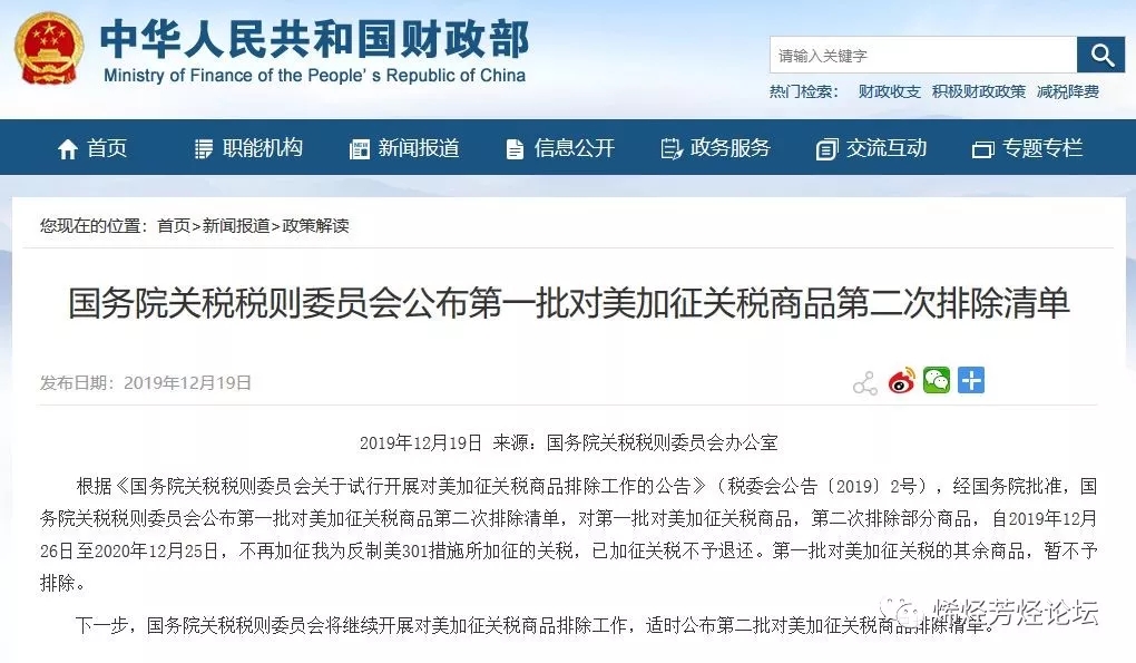對附件清單所列商品,自2019年12月26日至2020年12月25日(一年),不再加征我為反制美301措施所加征的關稅已加征的關稅稅款不予退還。