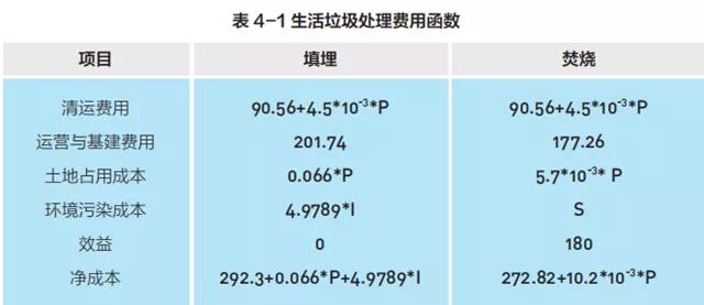 本文中的生活垃圾處置成本包括收集、運輸、轉運和處理成本,其中,垃圾處理相關費用包括:垃圾清運成本、運營和基建成本、土地占用成本、環境污染成本和效益,具體單位處理成本見表 4-1。垃圾填埋的環境成本包括垃圾填埋場主要的污染源——垃圾滲濾液的環境污染成本。焚燒處理的環境成本系通過疾病成本法來核算二噁英致癌成本。效益指垃圾焚燒發電收入;