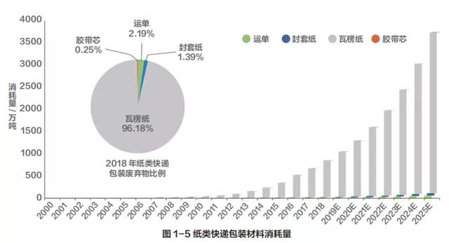 紙類包裝材料以瓦楞紙為主,占比達 96.18%,其他紙類材料包括運單和文件袋封套,以及間接包裝材料膠帶芯,合計占比 3.82%。2018 年我國快遞行業瓦楞紙消耗量達 823.3 萬噸,快遞運單 18.71萬噸。其中,快遞運單又分為電子運單和傳統運單。傳統運單一般有四聯,重量約為 7.5g。電子運單的重量約為傳統運單的 32%。2018 年我國的電子運單使用率約為 70%,傳統運單為 30%。若將電子運單的使用率提高到 90%,將節約 5 萬噸運單用紙(詳見圖 1-5)。