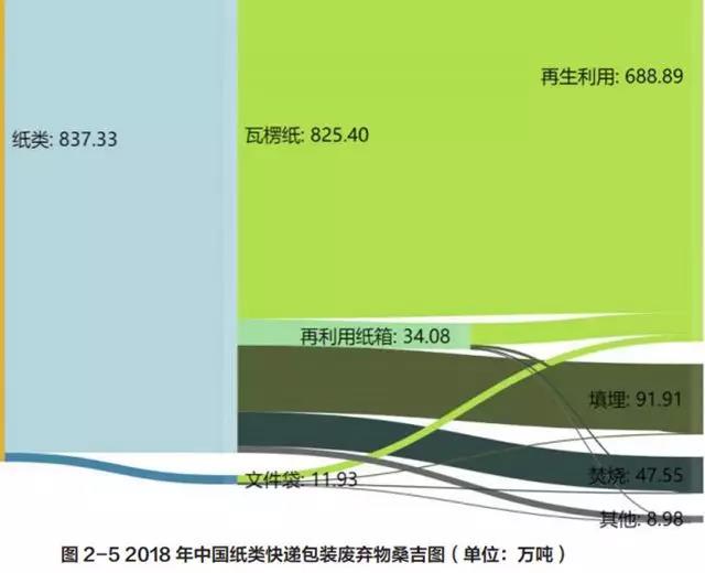 調查發現快遞紙箱類包裝廢棄物只有不到 5% 被重復使用,按重量計算約有 80% 的紙箱被回收,還有約 15% 混入生活垃圾。以 2018 年為例,我國快遞行業共消耗紙類包裝材料 837.33 萬噸(不包括快遞單號紙),其中文件袋用紙 11.93 萬噸,瓦楞紙箱、紙筒和膠帶芯等瓦楞紙消耗量 825.40 萬噸。這其中僅有約 34.08 萬噸的瓦楞紙箱被重復使用,通過流動回收業者回收的約有 688.89 萬噸快遞包裝廢紙(瓦楞紙 679.43 萬噸,文件袋 9.46 萬噸)。計算得到快遞紙類包裝產生量和流量信息如圖 2-5 所示: