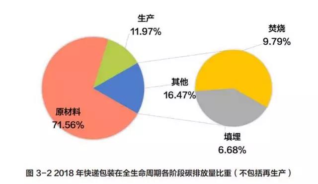 從圖 3-2 和圖 3-3 中可知,在 2018 年我國快遞包裝材料在生命周期各階段中(不包括再生),原材料階段(71.56%)的碳排放所占比重大,處置階段占比重較小(焚燒 9.79%,填埋6.68%),生產階段(11.97%)占比小。