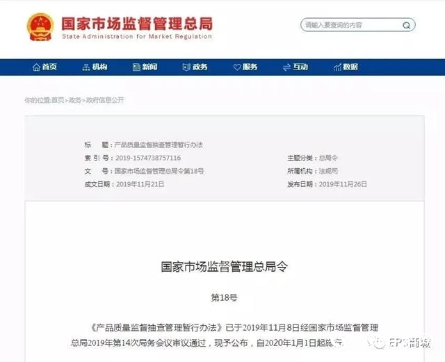 11月26日,國家市場監督管理總局發布《產品質量監督抽查管理暫行辦法》,將自2020年1月1日起施行。《辦法》共56條,明確了監督抽查的組織、抽樣、檢驗、異議處理、結果處理及相關人員應承擔的法律責任,對于加強產品質量監督管理、規范產品質量監督抽查工作、保護消費者的合法權益有重要意義。