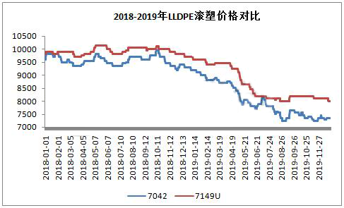 從圖中顯示,2018-2019年國內滾塑料價格明顯高于普通線性,且價格差距逐步擴大,2019年較普通線性高50-850元/噸。目前國內聚烯烴行業產能過剩,國內石化一直致力于高端產品研發,搶占高端領域,以獲取較大利潤。從線性區域來看,由于產能過剩,7042價格近兩年一直處于下行通道,削減了石化利潤。線性行業,近年來,研發主要方向集中在C8線性,茂金屬、滾塑料等,其中滾塑料做為一個分支,近年研發較多。