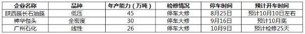 ????????9月份國內PE裝置檢修較上月稍有減少,PE共計損失量16.8萬噸。月內神華包頭全密度裝置、延能化低壓裝置大修,茂名石化老高壓停車檢修、上海石化低壓裝置故障停車目前仍未重啟。神華新疆高壓裝置、獨山子石化全套PE裝置、中安聯合線性裝置、中煤榆林全密度裝置開車,揚子巴斯夫、蘭州石化高壓裝置、四川石化低壓裝置月內短暫停車目前均已經重啟。整體來看,9月中下旬部分石化檢修裝置陸續重啟,國內PE供應較前期緩慢增加。