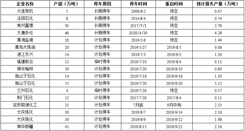 8月份國內聚丙烯計劃裝置檢修匯總