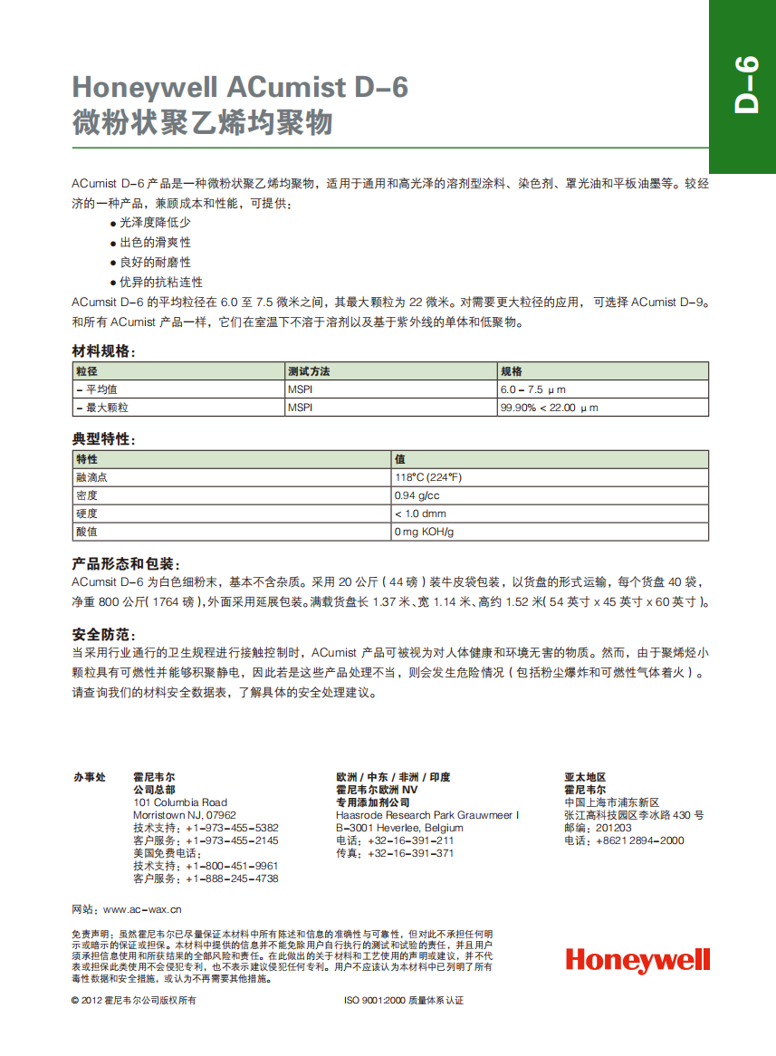 - 霍尼韋爾微粉蠟D6聚乙烯均聚物Honeywell ACumist D-6 物性表, 霍尼韋爾微粉蠟D6聚乙烯均聚物Honeywell ACumist D-6 產品參數(shù),霍尼韋爾微粉蠟D6聚乙烯均聚物Honeywell ACumist D-6 性能表,霍尼韋爾微粉蠟D6聚乙烯均聚物Honeywell ACumist D-6 出廠報告, MSDS,, 物質安全資料表, UL黃卡,{ SGS報告, RoHS, 食品級認證, NSF飲用水標準, 產品資料, 產品性能, 出廠報告, 原廠原包, 代理商, 熱變形溫度, 熔指數(shù), 流動系數(shù), 抗沖擊性能、沖擊強度, 低溫韌性、低溫抗沖擊性能, 熔體流動系數(shù)、熔體流動速率, 加工工藝、加工參數(shù)、加工溫度, 歐盟RoHS 德國FDA 美國FDA 日本FDA