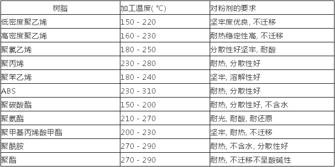 ????????樹(shù)脂加工溫度及對(duì)著色劑的要求: