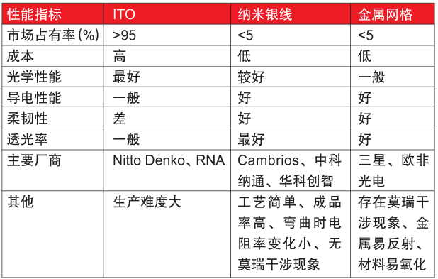 ????????納米銀線是一種直徑在納米范圍(一般在20-100納米之間)、長(zhǎng)度沒(méi)有限制的金屬銀一維纖維。納米銀線具有體積小、比表面積大、良好化學(xué)性能和催性能、導(dǎo)電性能、抗菌性能和生理相容性,具體如表4所示。納米銀線的生產(chǎn)方法有:模板輔助、多元醇、光波輻射、軟化學(xué)溶劑熱等,多元醇法由于操作簡(jiǎn)單、生產(chǎn)效率高、成本低廉成為當(dāng)前主流生產(chǎn)方法,缺點(diǎn)是產(chǎn)品濃度低。例如納米銀線可以生產(chǎn)透明柔軟塑料導(dǎo)電膜,具體結(jié)構(gòu)為基材為PET薄膜,涂覆層為納米銀線分散液,表層為丙烯酸保護(hù)涂層。基材為支撐層,中間涂層為透明導(dǎo)電層,保護(hù)層為保護(hù)銀不被氧化降低導(dǎo)電性能,主要替代ITO和金屬網(wǎng)透明導(dǎo)電薄膜。
