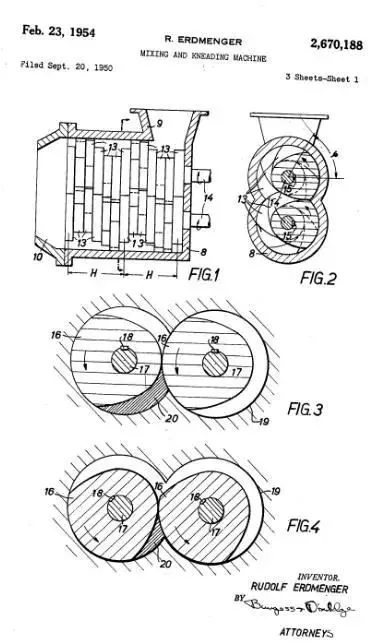 ????????直到1940年代,一支由數(shù)學(xué)家、物理學(xué)家、工程師和一批機(jī)械專家組成的隊(duì)伍,在德國(guó)薩克森-安哈爾特州的IG工廠,開始了系統(tǒng)性研究這類嚙合同向雙螺桿擠出機(jī)。其中就有大名鼎鼎的W. Meskat,A. Geberg和Rudolf Erdmenger。(不會(huì)念這些名字?沒關(guān)系,看個(gè)意思就行)
