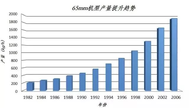 ????????由圖可以看到,以65mm機(jī)型為例,從1980s到2000s,將近20年時(shí)間里產(chǎn)量提升了近10倍。比扭矩從ZSK第一代的4Nm/d3已發(fā)展到18+ Nm/d3,大小徑比從1.22提高到1.80,物料的平均停留時(shí)間也由數(shù)十分鐘降低到了僅僅數(shù)十秒。
