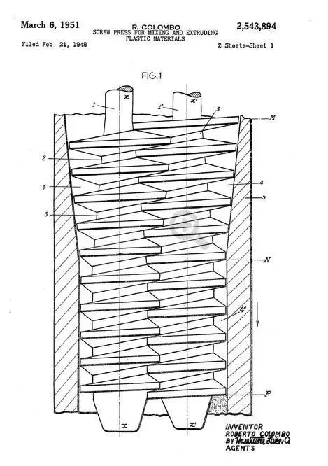 Colombo Roberto在美國(guó)申請(qǐng)的一系列專利中的一篇——screw press for mixing and extruding plastic materials(1951)