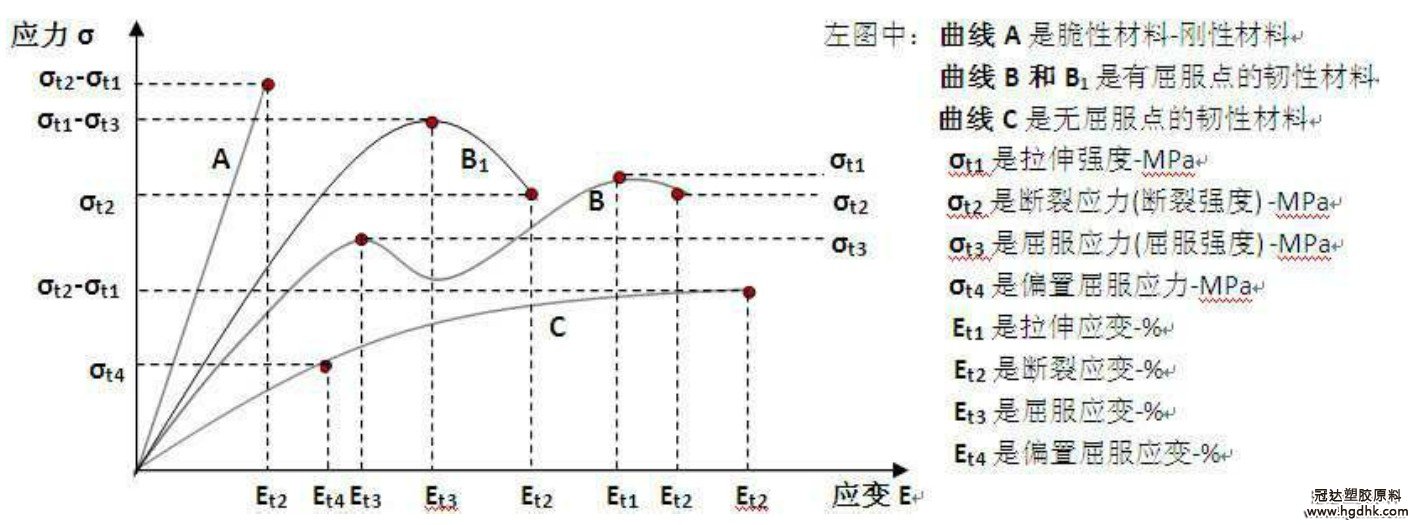曲線 B1 是常見的曲線,屈服強度等于拉伸強度。我們給客戶測試時常出現如此曲線。高韌性的材料其拉伸強度高于屈服應力,曲線 B 就是拉伸強度高于屈服應 力,我們在給供應商測試加了沖擊改性劑的 PS 材料時,就出現了曲線 B 的現象。該材料比 PS 的沖擊強度提高許多,是高韌性材料了。 在 GB/T9341-2000 塑料彎曲試驗方法中:只有具有線性應力-應變特性的材料。其彎曲性能才能作為工程設計的依據,而非線性材料的彎曲性能僅是公稱值。 對于脆性材料,即難于作拉伸試驗的材料,最好采用彎曲試驗。